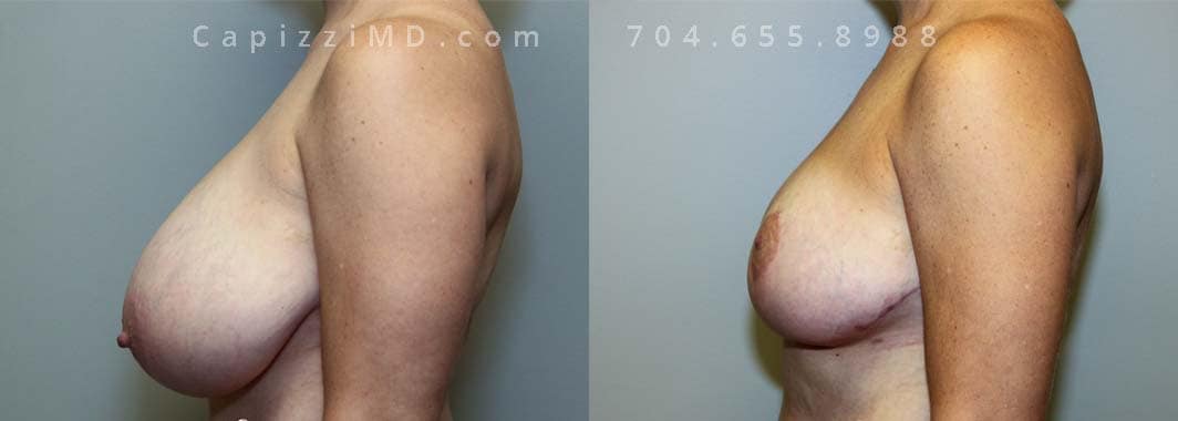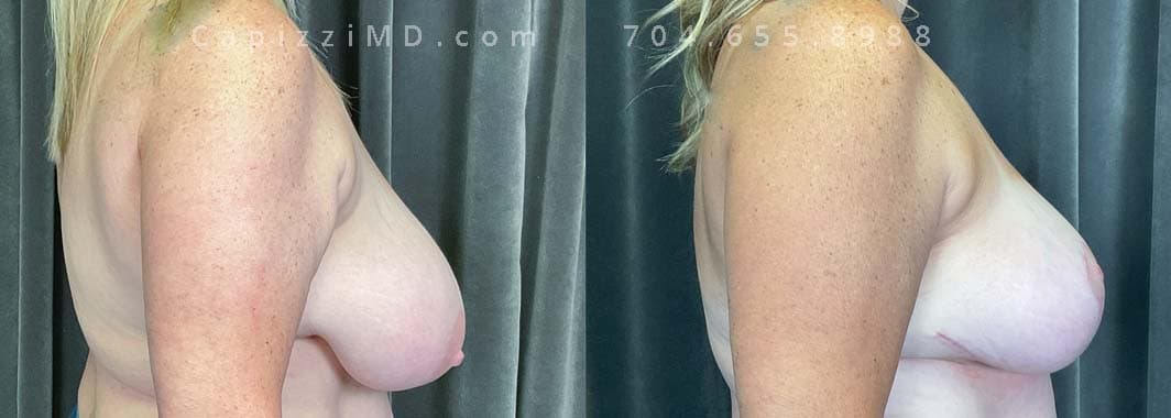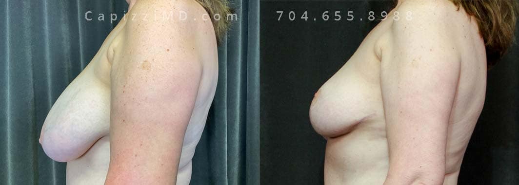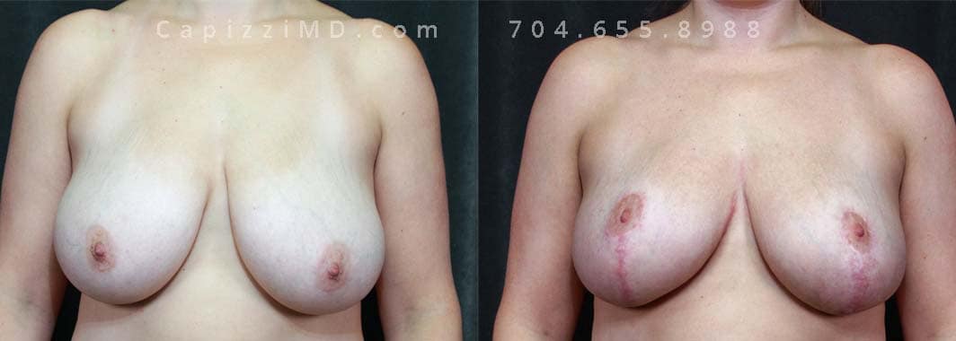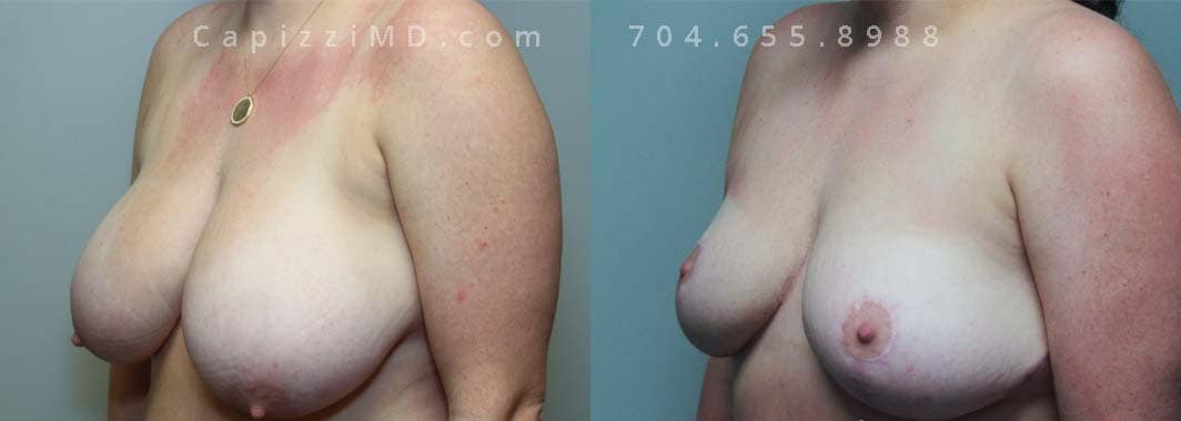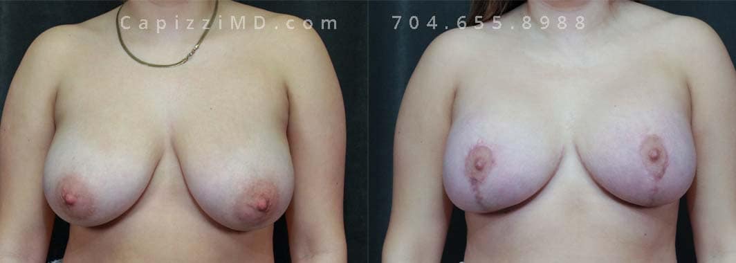 The patient had children and noticed that her breasts stayed large after she discontinued nursing. A breast reduction reduced the size of her breasts, removed excess skin, and realigned her nipples.