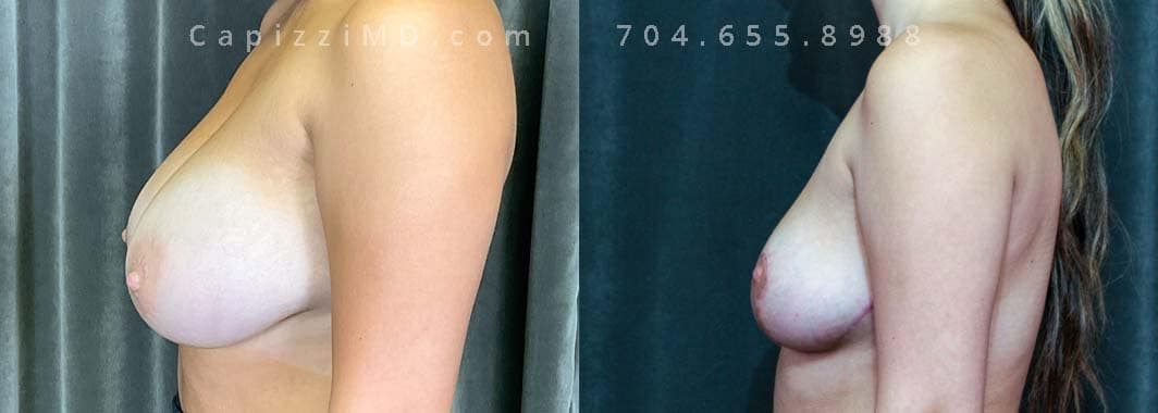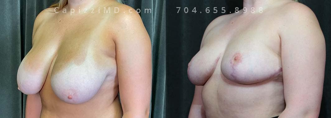 This patient had larger breasts than desired and wanted to have a smaller, more perky look. A breast reduction alleviated physical symptoms such as back/neck pain while also giving her a naturally smaller breast shape.