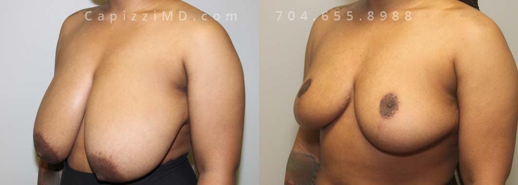 This patient’s large breasts were giving her issues in her daily life and she wanted them smaller to better accommodate her day-to-day. A breast reduction realigned her nipples, resized her areolas, and gave her the result she was hoping for.