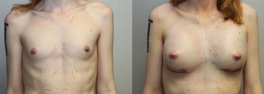 This patient had large, sagging breasts that she wished to reduce. She is pictured only one month after her breast reduction, hence a pinker scar. Any surgical incisions are pink for the first 12 months, before fading into the skin tone of the patient.