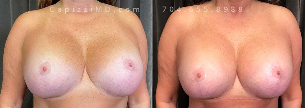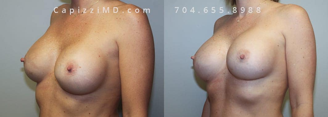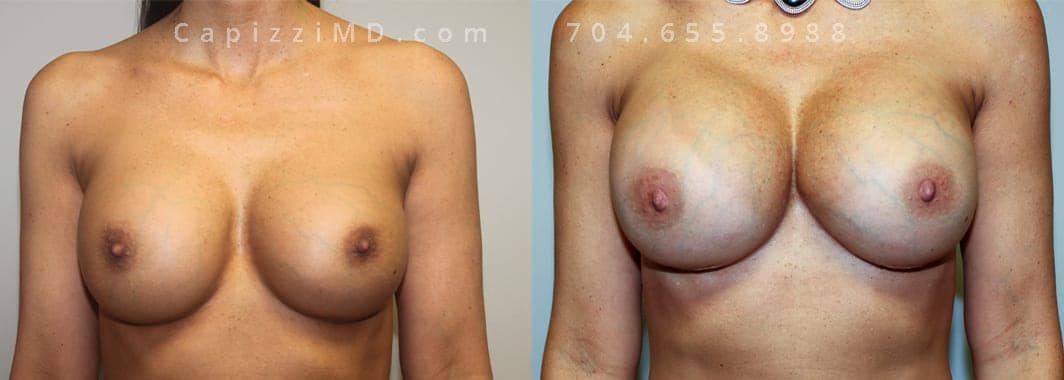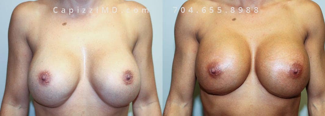 This patient desired a larger breast size and had an implant exchange, going from a Sientra Smooth Round High Profile 350cc implant to a Sientra Textured Round High Profile 590cc implant. She had capsule work done as well to improve symmetry.