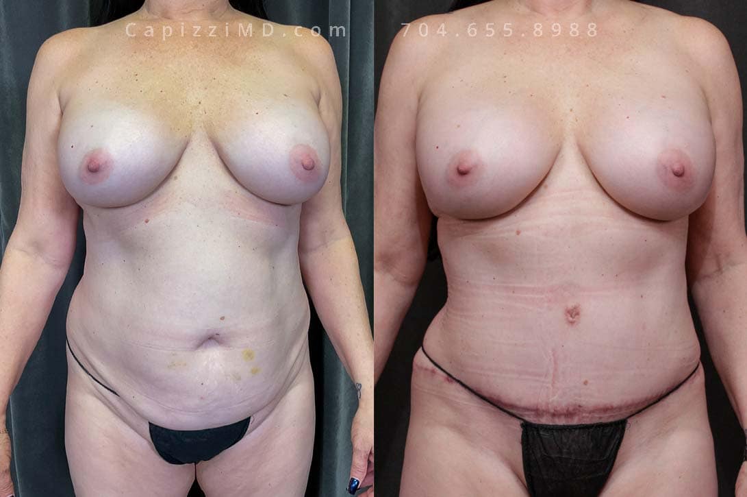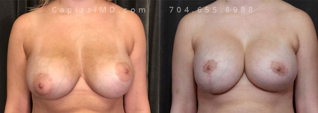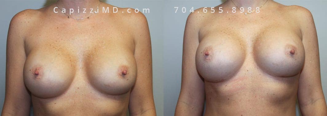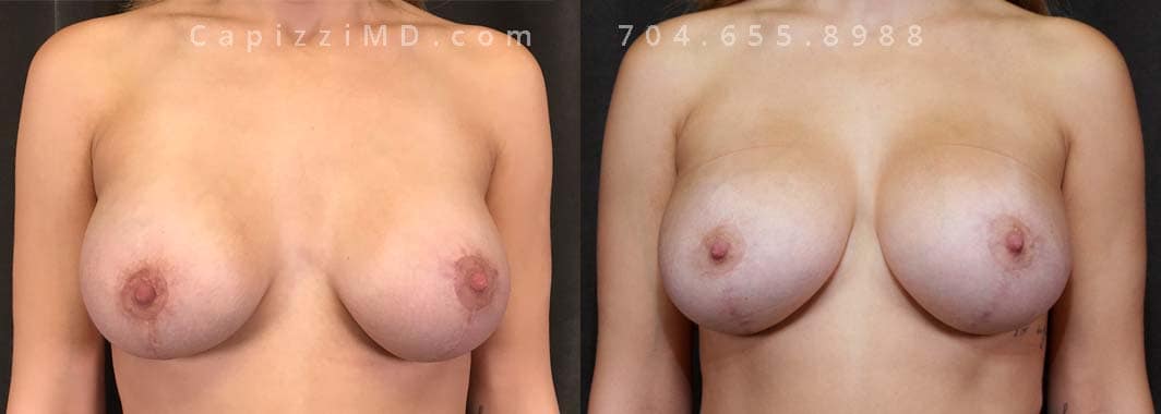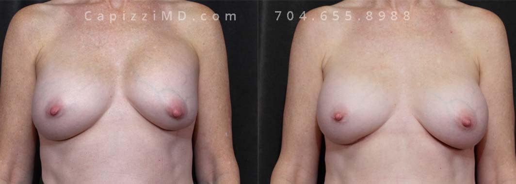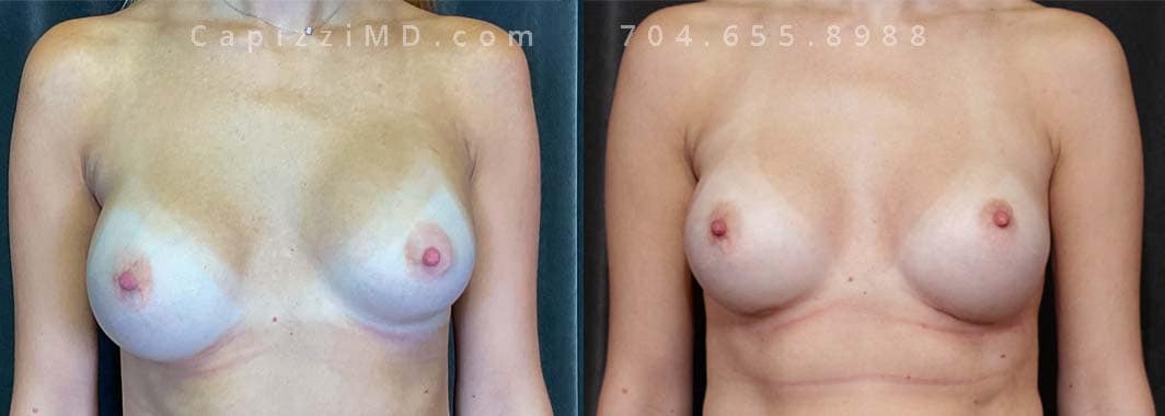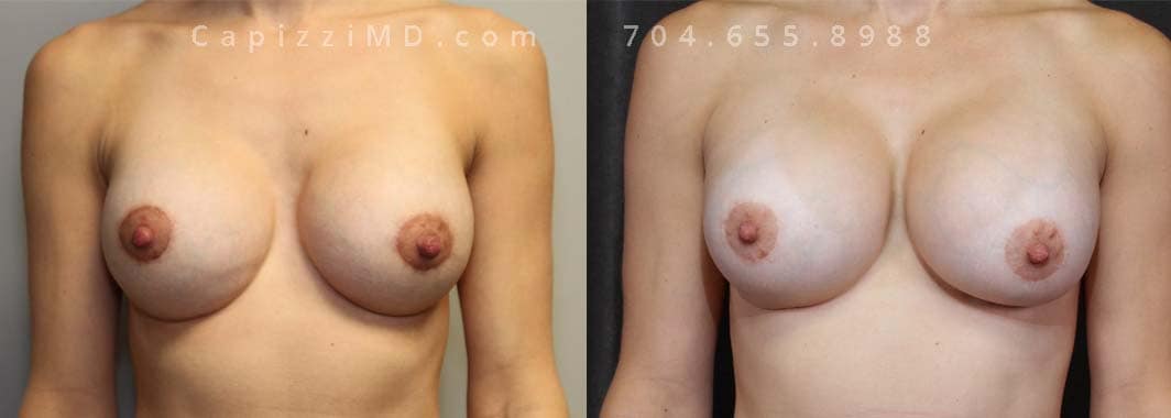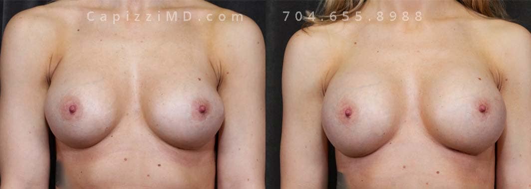This patient wanted a bigger size and improved symmetry. She had Allergan Smooth Round Style 20 280cc implants and opted to have them replaced with Sientra Smooth Round High Profile 415cc with capsuloraphies to improve the appearance of her breasts.