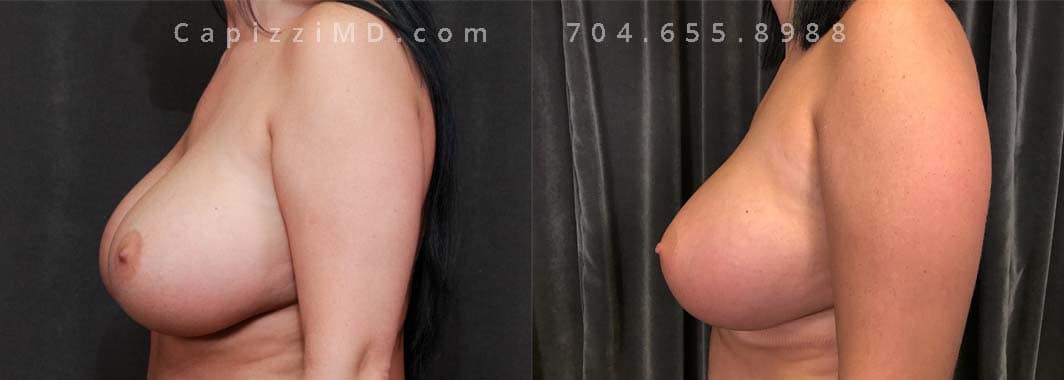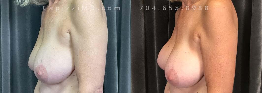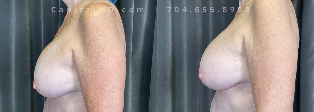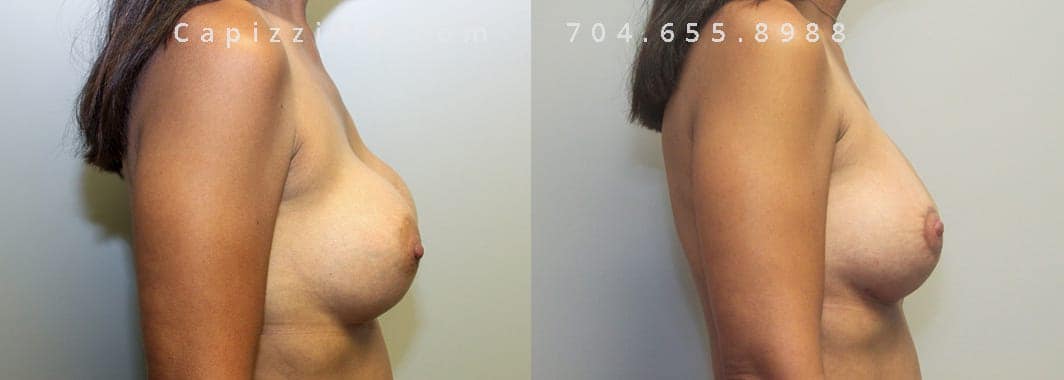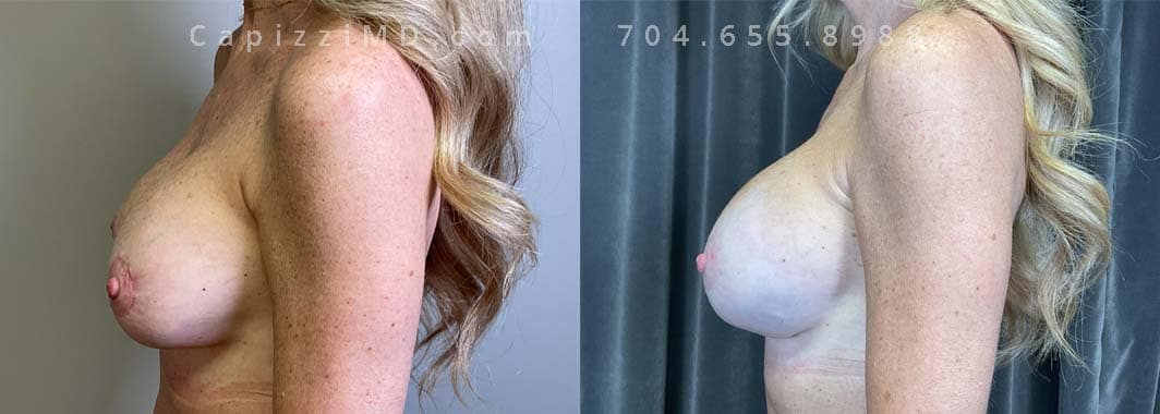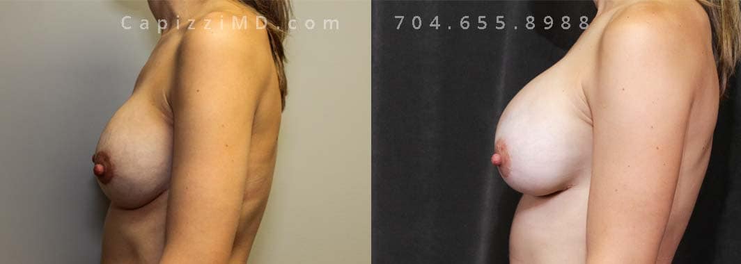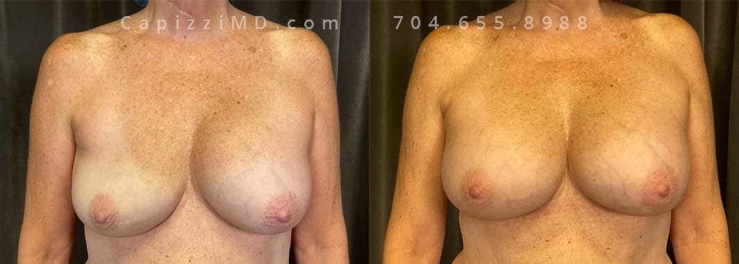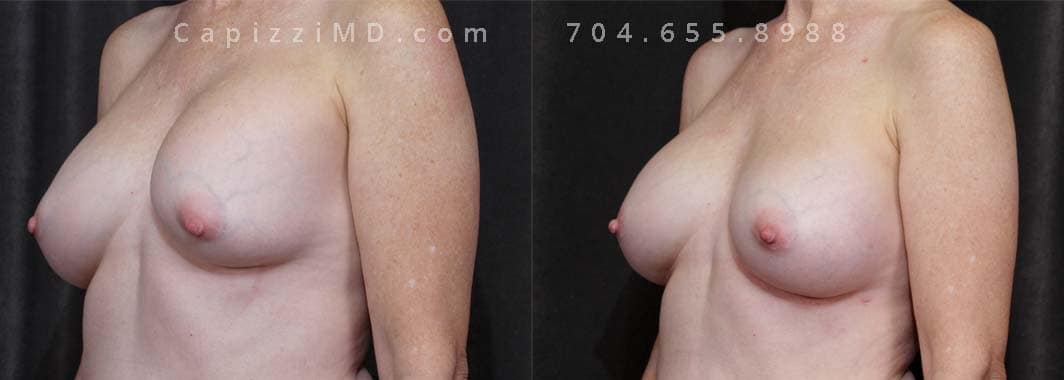 This patient experienced a right side rupture of her silicone implant. Her implants were exchanged for Sientra Smooth Round High Profile 285cc implants along with a modified breast lift for improved symmetry and appearance.