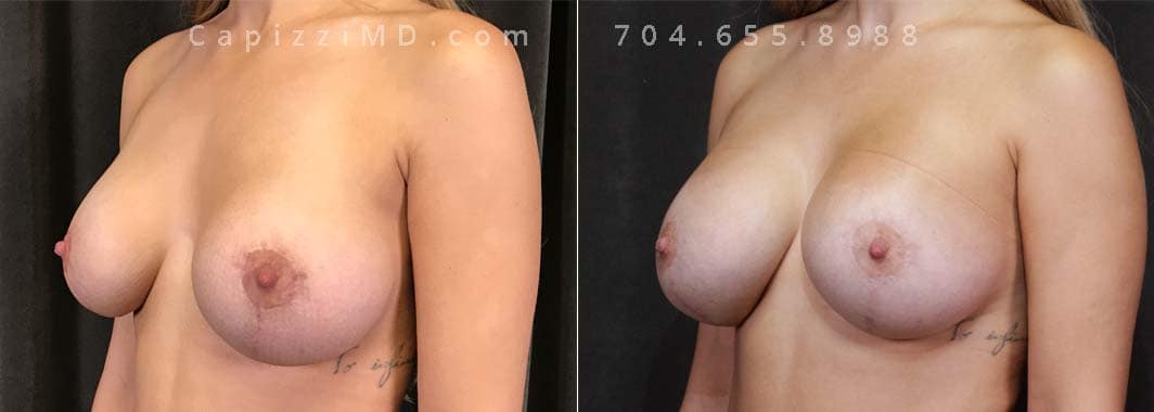 This patient was experiencing asymmetry and her left breast was “bottoming out.” Her Allergan Smooth Round Saline 320cc implants were removed and replaced with Sientra Textured Round High Profile 565cc implants to achieve better upper pole fullness and a larger appearance.