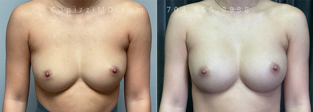 This patient desired an enhanced size and better upper pole fullness. She had her Allergan Smooth Round Style 15 286cc implants replaced with Sientra Smooth Round High Profile 385cc implants for her results.