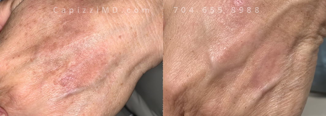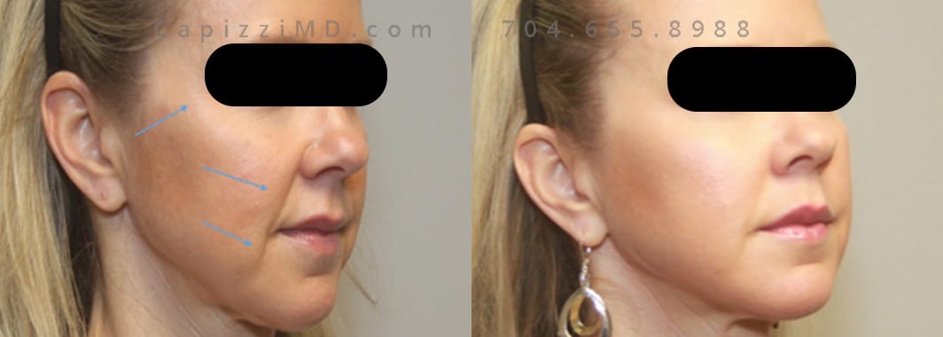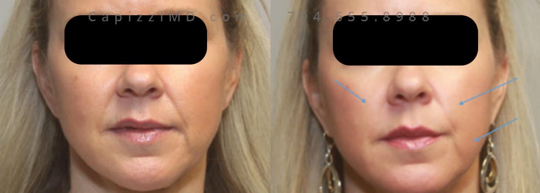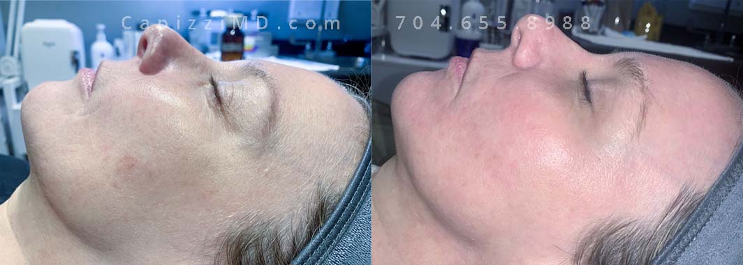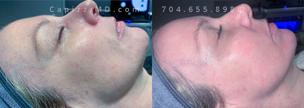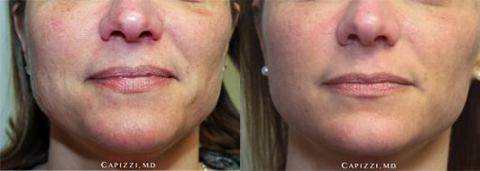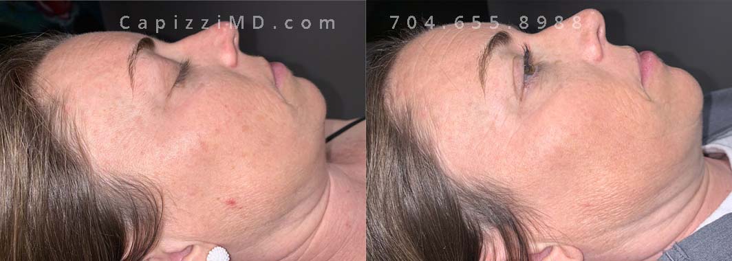 Dull skin and complexion. Crow’s feet improved significantly at 4- and 10-weeks post-treatment. Smile Lines) improved significantly. Skin above the upper lip looks smoother. Chin’s “pebble” appearance smoothed significantly.