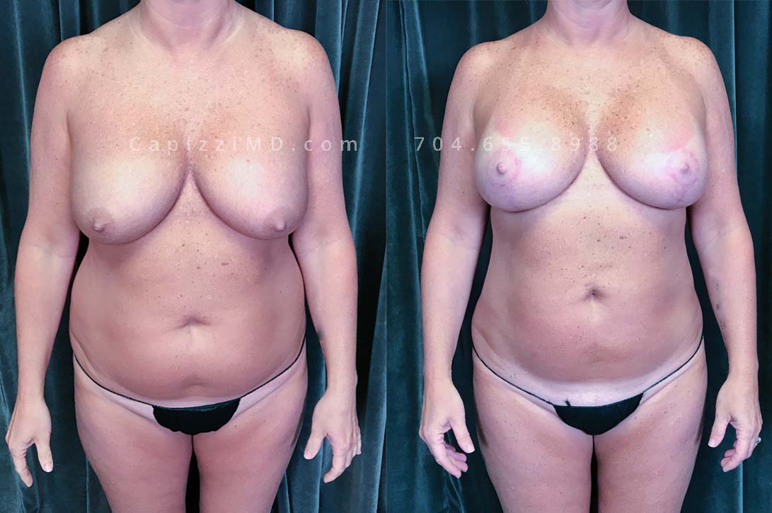 This patient had an implant exchange/breast revision to replace implants that were not positioned properly. She also had liposuction to flatten the appearance of her abdomen and love handles, erase her bra roll, and contour her inner/outer thighs.