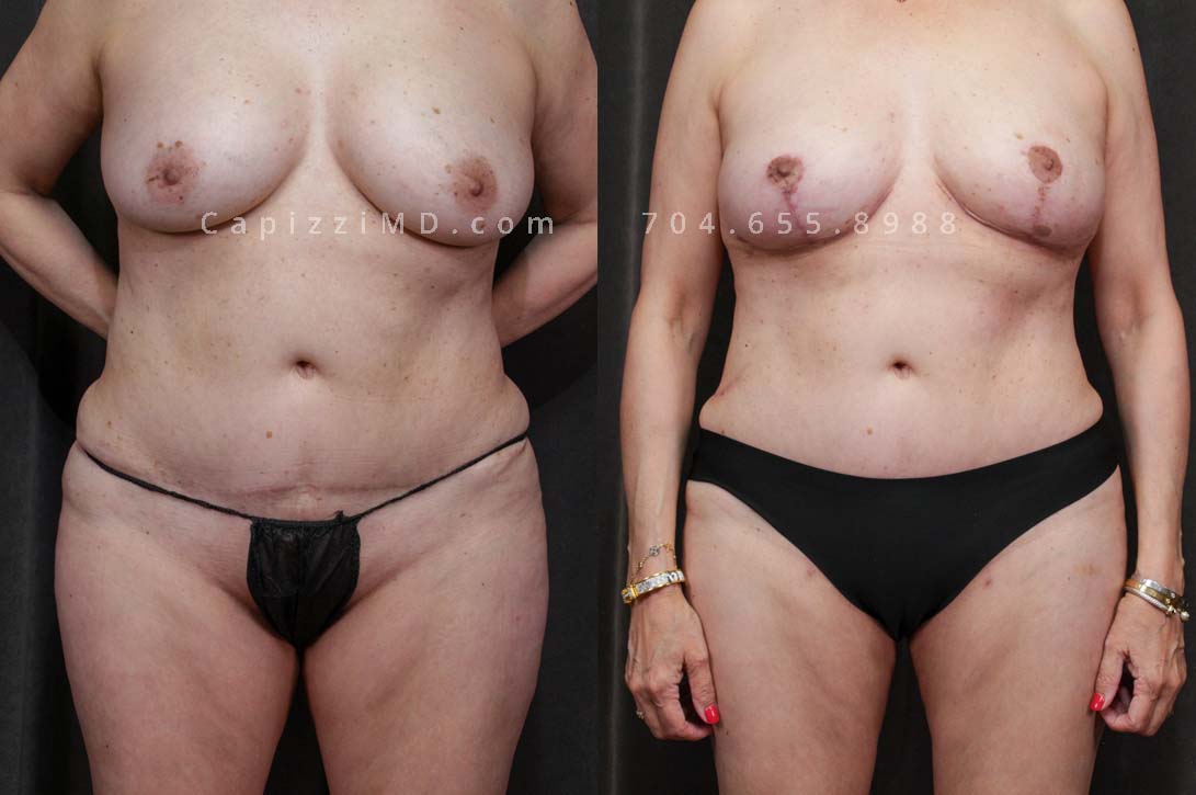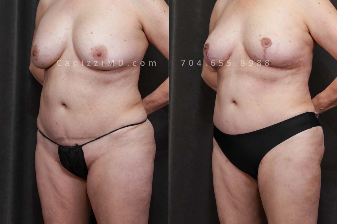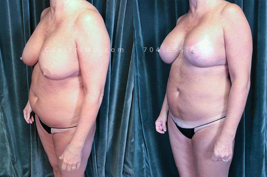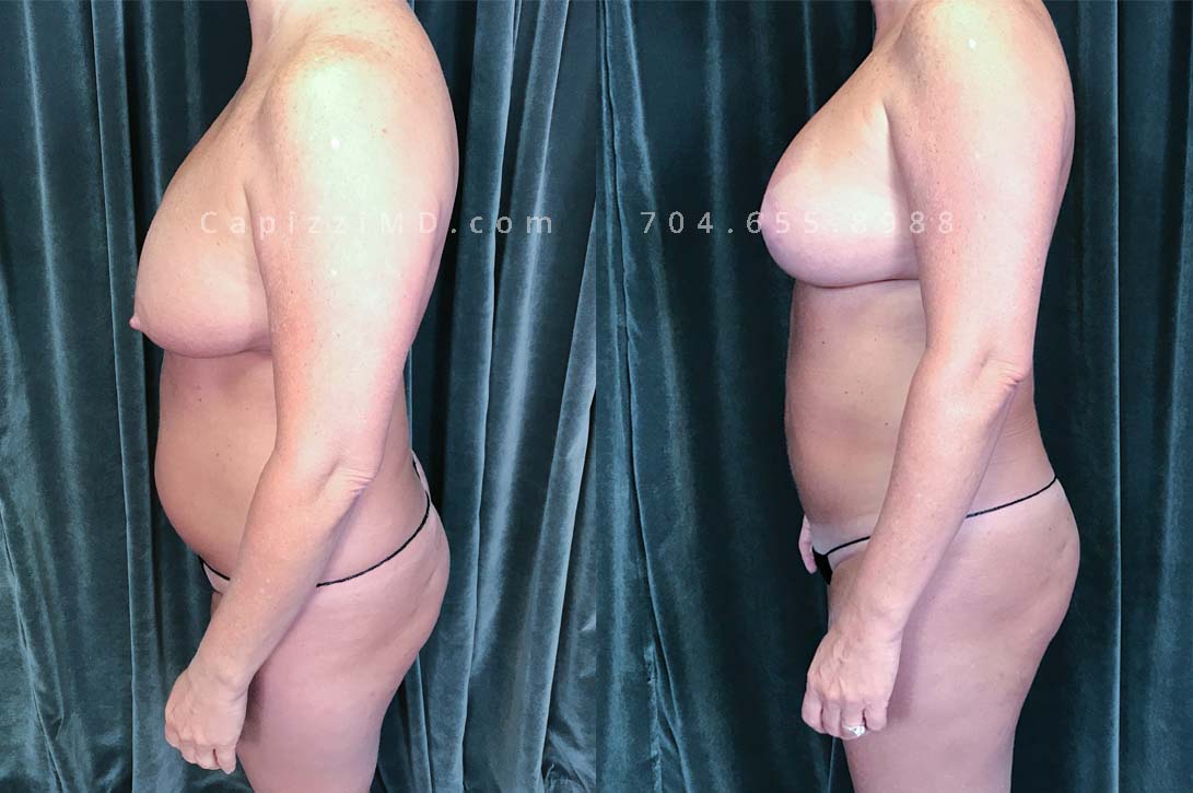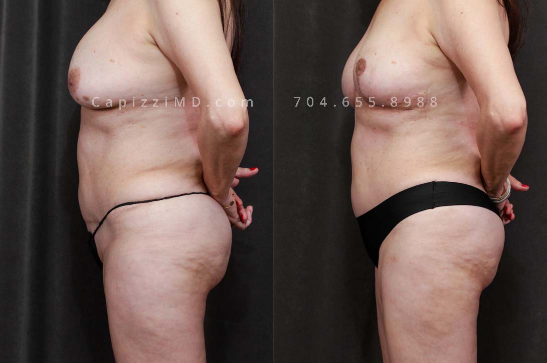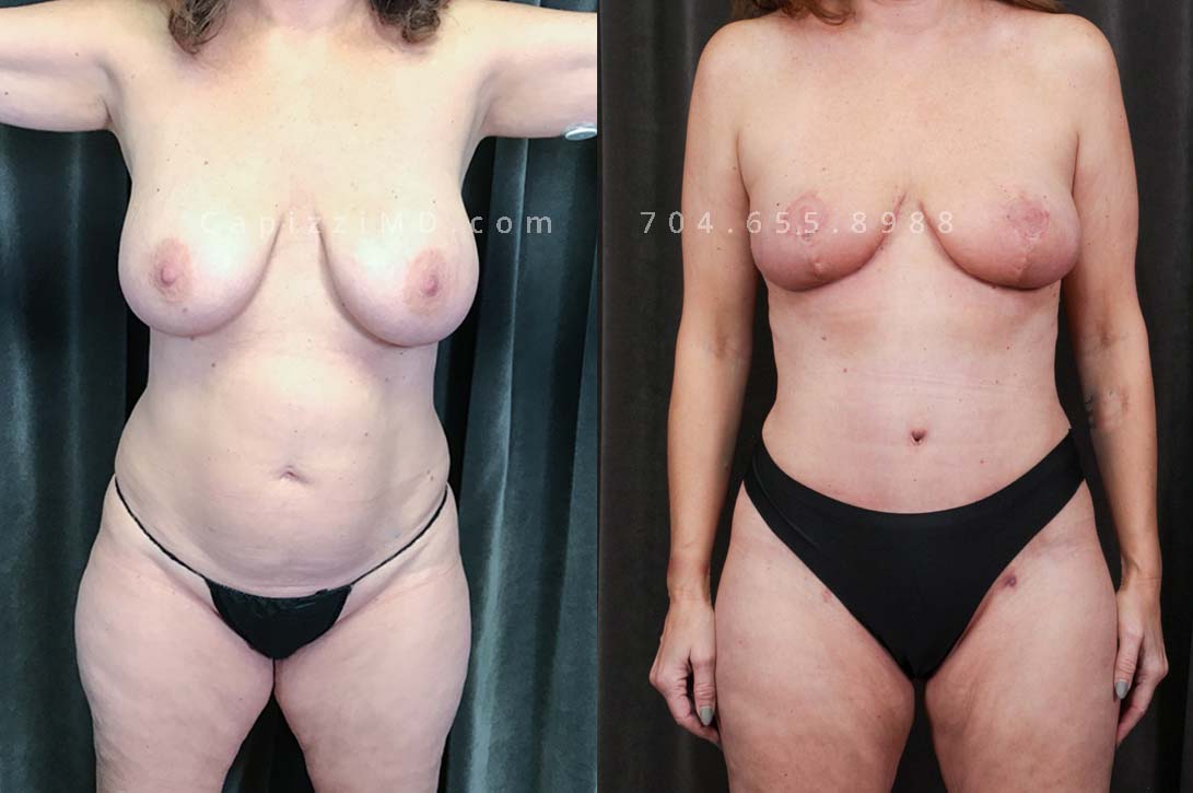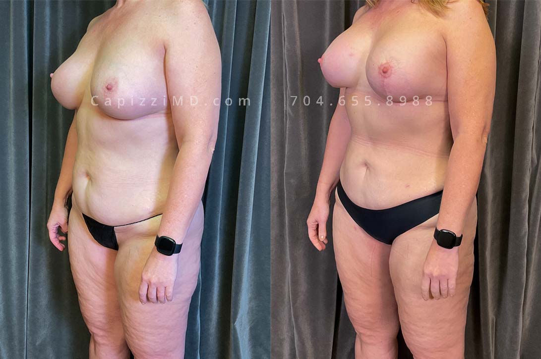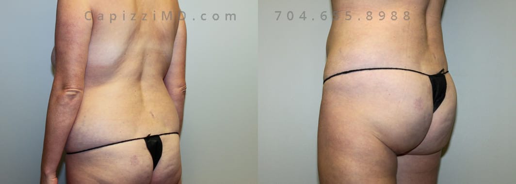 This patient received a breast revision/implant exchange, modified breast lift, and liposuction to her abdomen, posterior hips, bra roll, and inner/outer thighs. You’ll notice a flatter abdomen, smoother contour in her thighs, and more definition in the transition from back to buttocks.