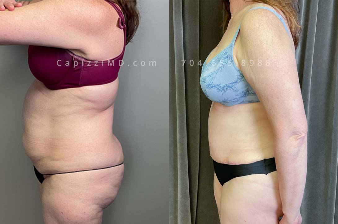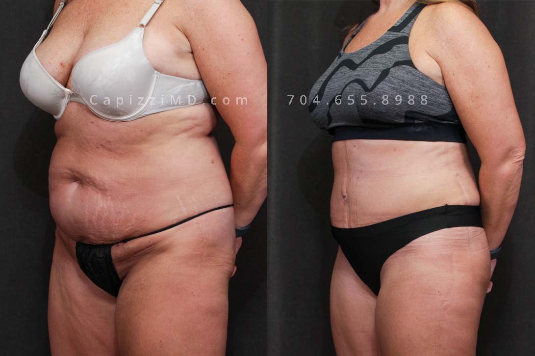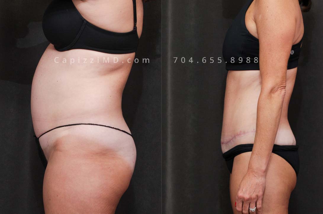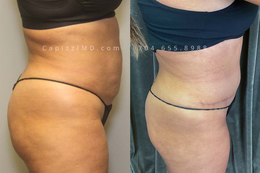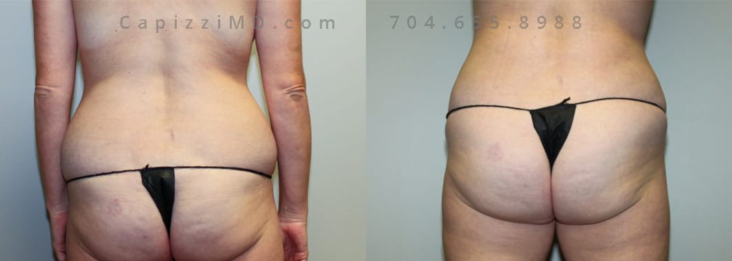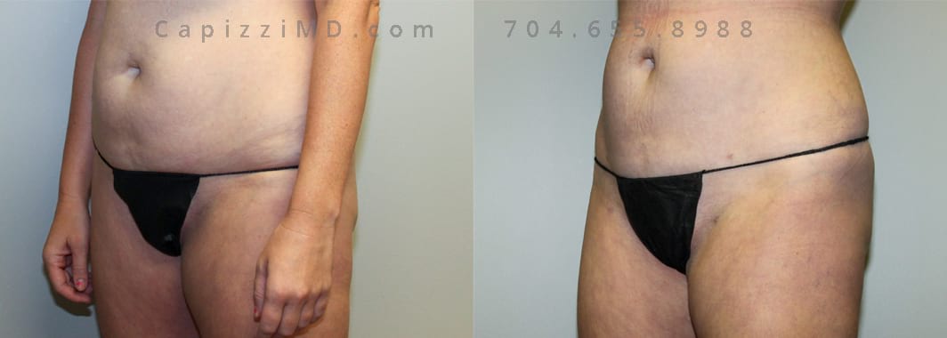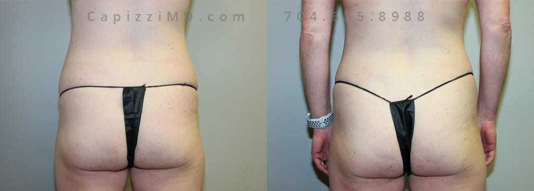 This patient had a standard tummy tuck with liposuction to her abdomen and posterior hips. This procedure gave her a more feminine waist, flatter abdomen, and a more defined, rounded buttocks.