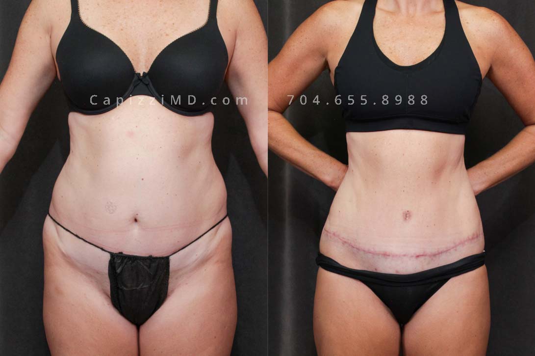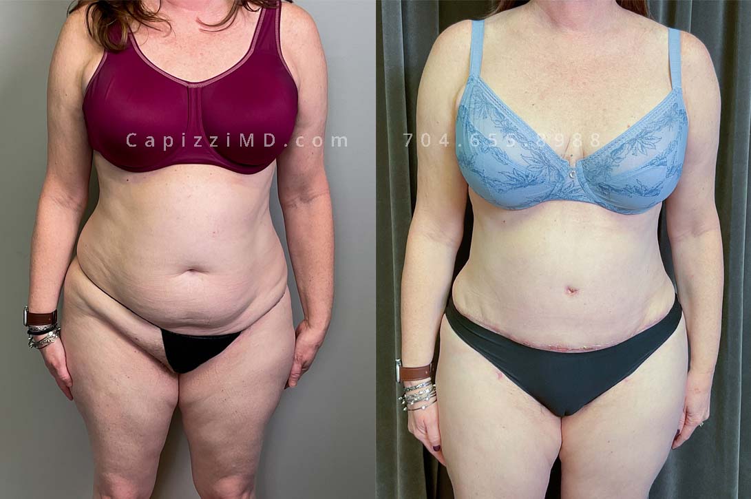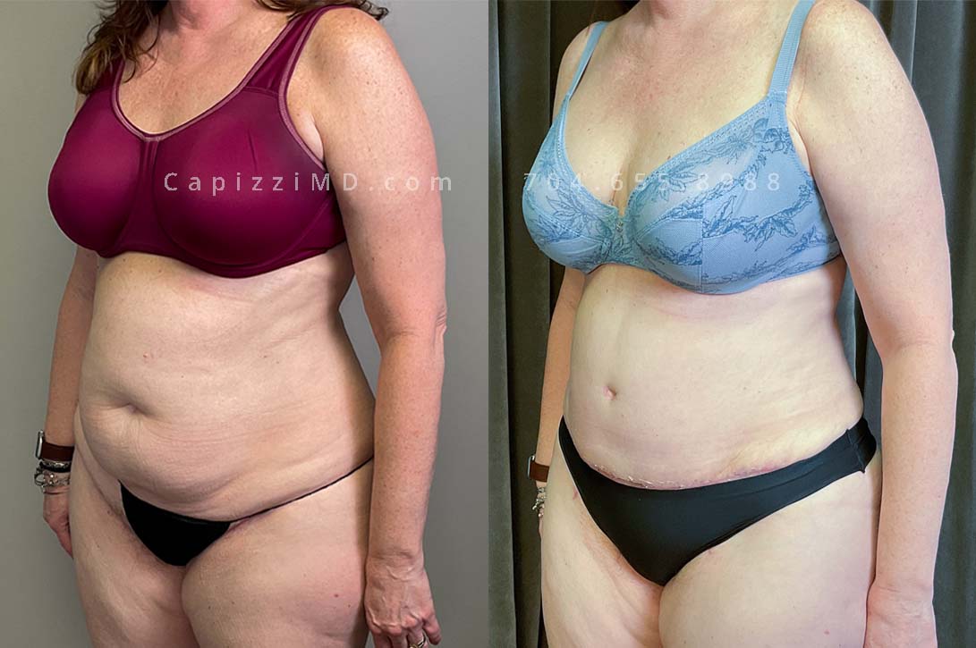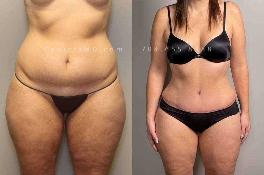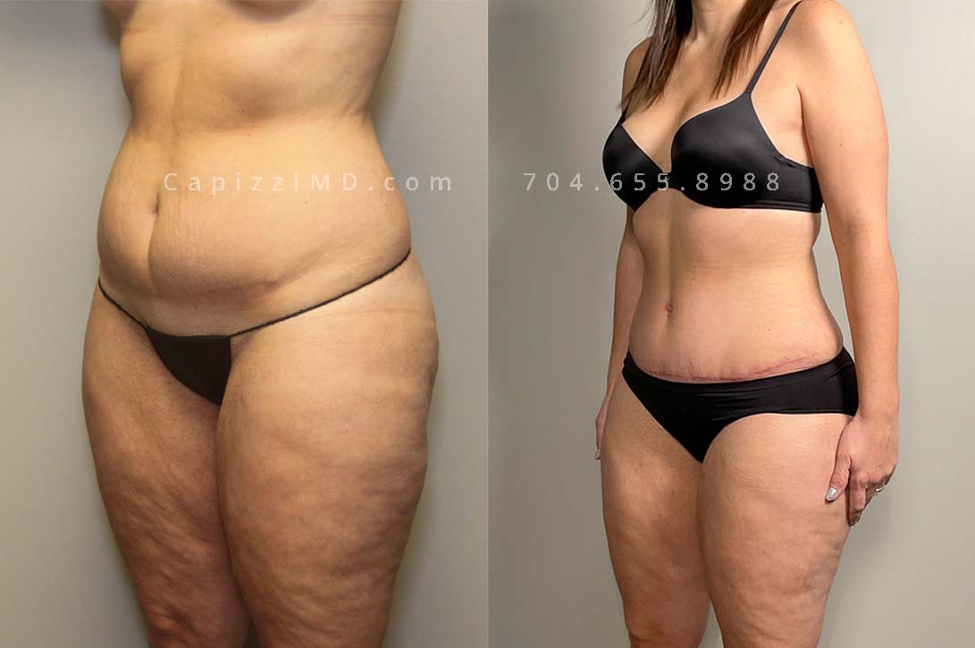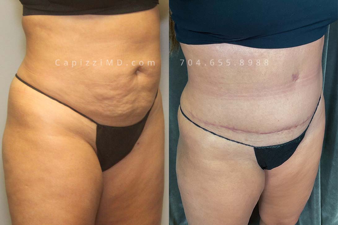 This patient received a standard tummy tuck and liposuction to her hips and lateral thighs. The standard tummy tuck removed stretch marks and scars caused by pregnancy while the liposuction removed excess fat in the love handles and thighs to contour her waist smoothly into her new, slimmer shape.