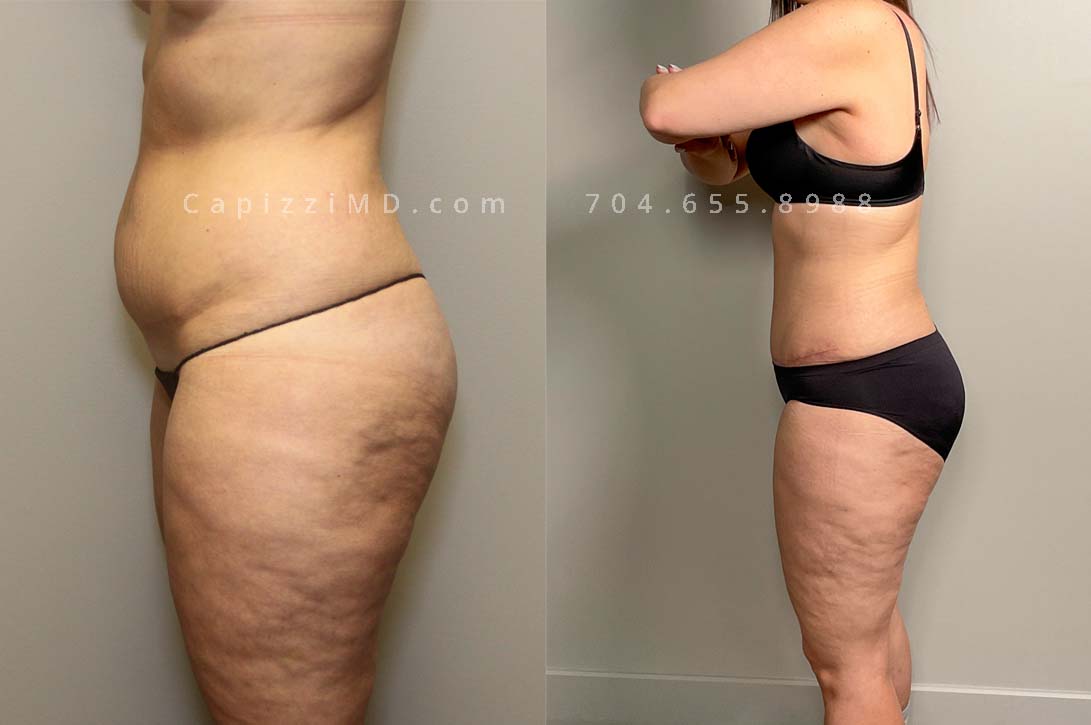 This patient had a beautiful result from a standard tummy tuck and liposuction to her abdomen, posterior hips, and inner/outer thighs. You’ll notice a slimmer, curvy waist with more definition in her leg muscles.