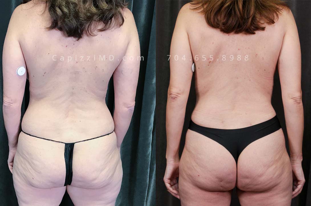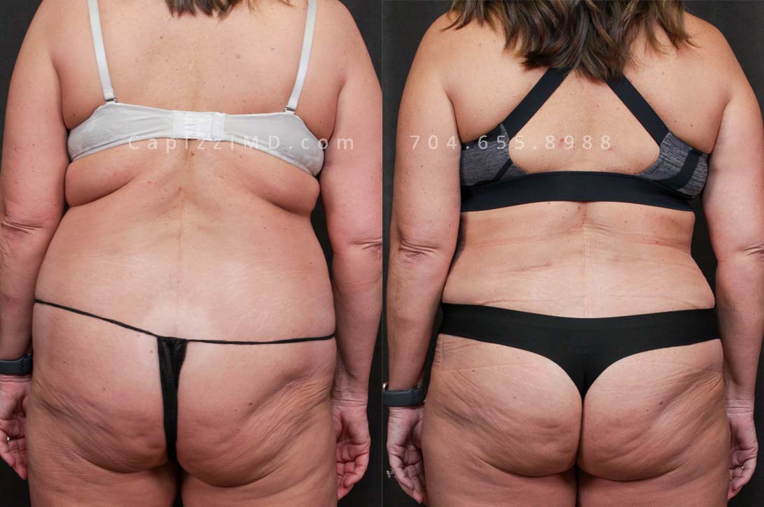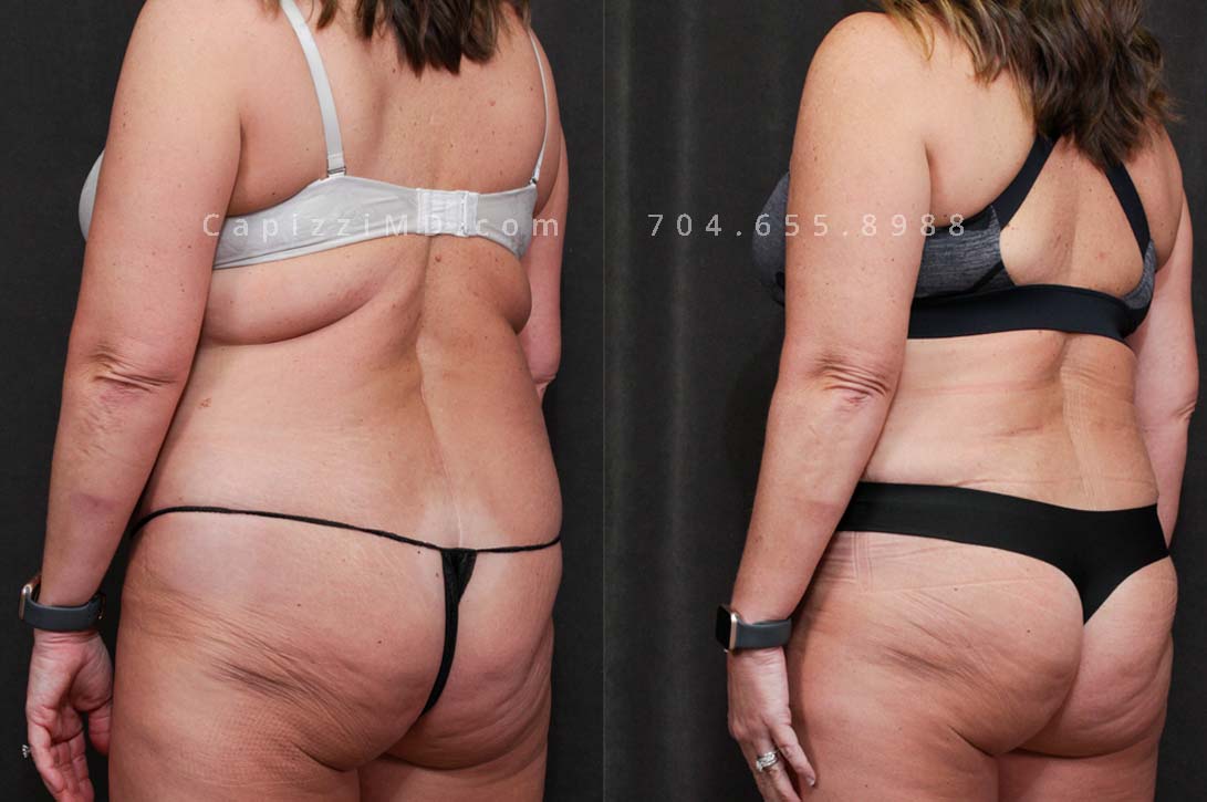 This patient received a breast revision with modified lift and liposuction to her bra roll, posterior hips, and inner/outer thighs. You’ll notice a smoother transition from her hips to her thighs and a more pronounced buttocks from her body contouring.