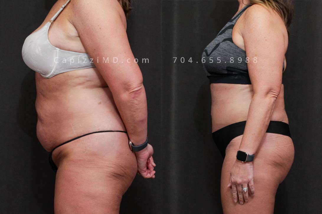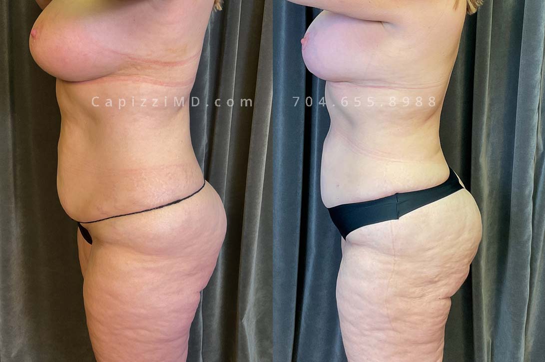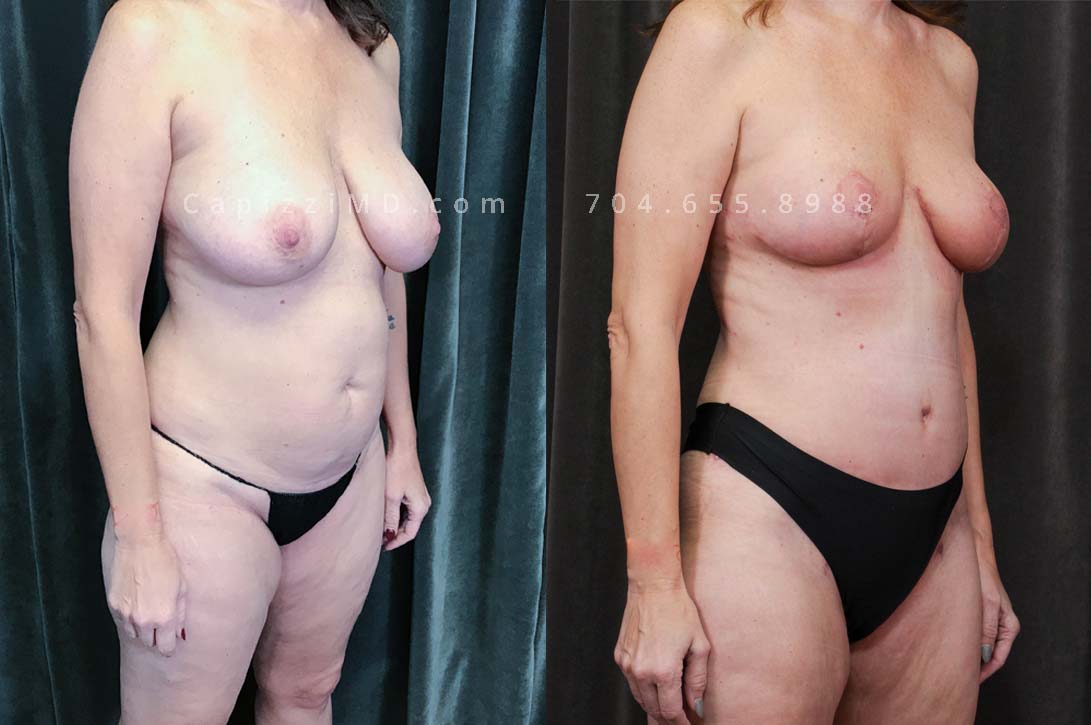 This patient received a full breast lift, tummy tuck, and liposuction to her abdomen, posterior hips, bra roll, and inner/outer thighs. You will notice lifted, perkier breasts with a tighter waist and slimmer thighs.